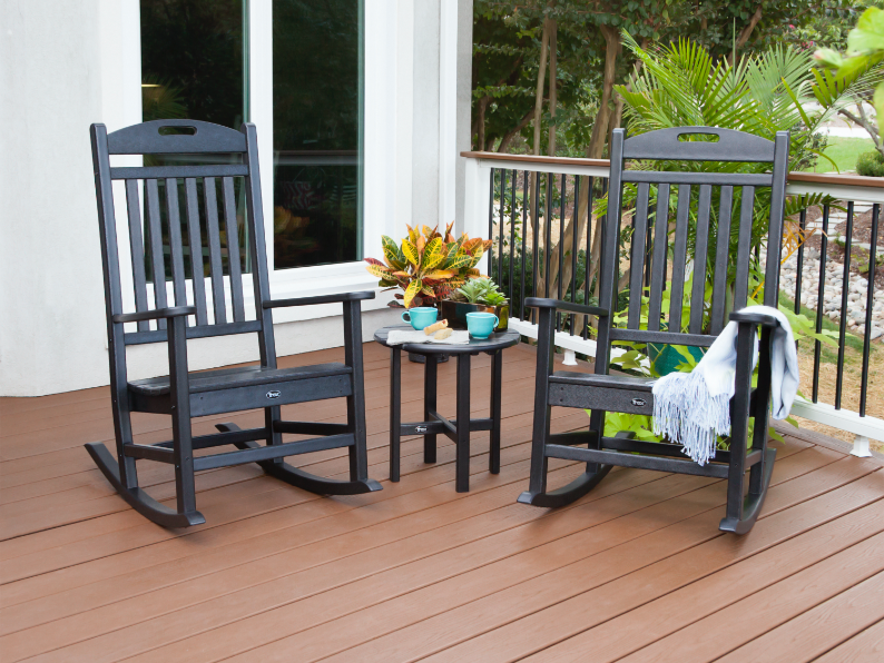 We construct our outdoor rocking chairs from genuine POLYWOOD lumber, a durable material that’s made using recycled ocean-bound and landfill-bound HDPE plastics.