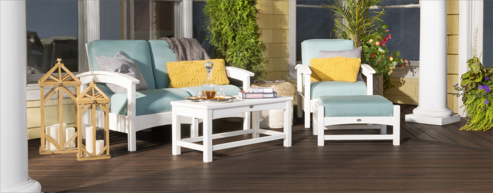 Trex Outdoor Furniture cushions, pillows, and umbrellas are made in the USA with all-weather performance fabrics that: